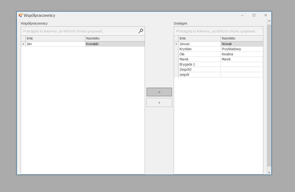 Zaznaczamy interesujące nas nazwiska i strzałką na środku przenosimy dane na listę zespołu.