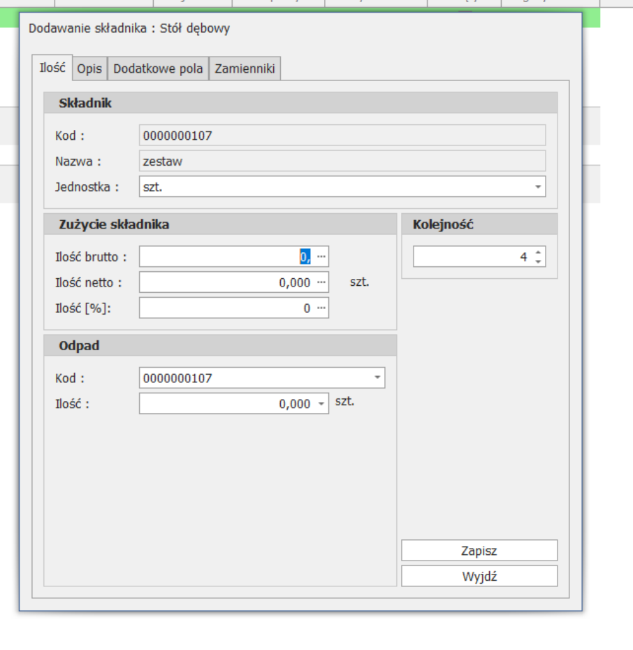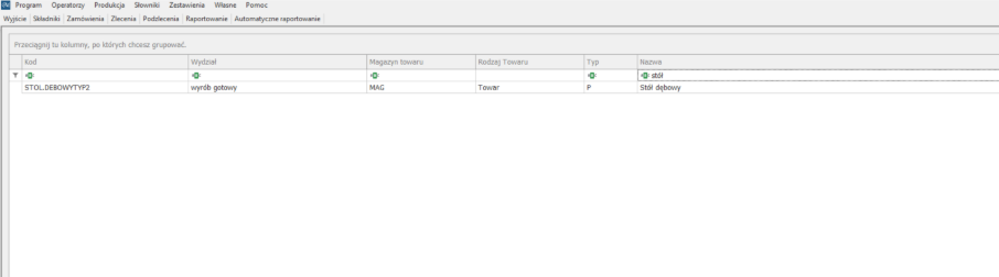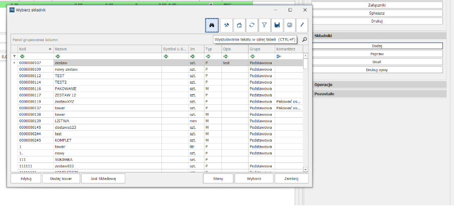 W celu edycji struktury, wybranego produktu, wyszukujemy go na ekranie składników: