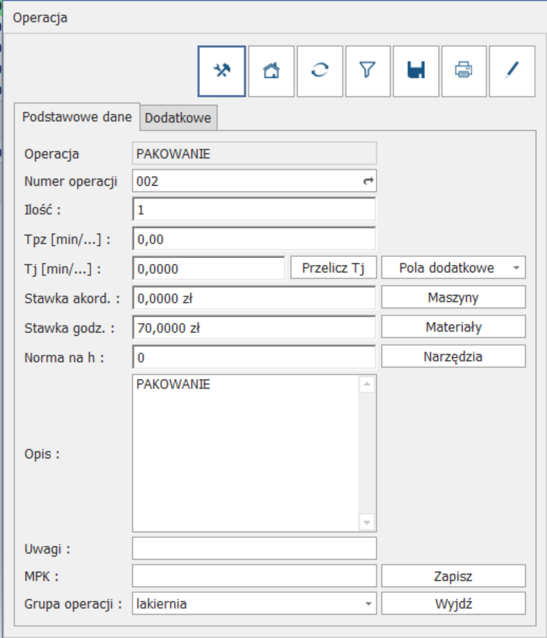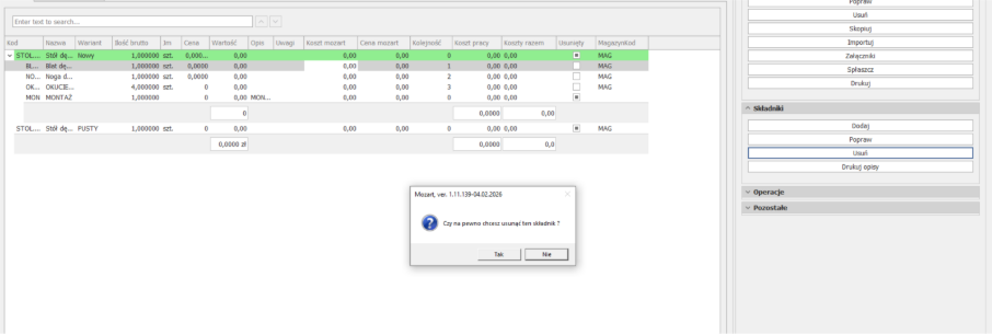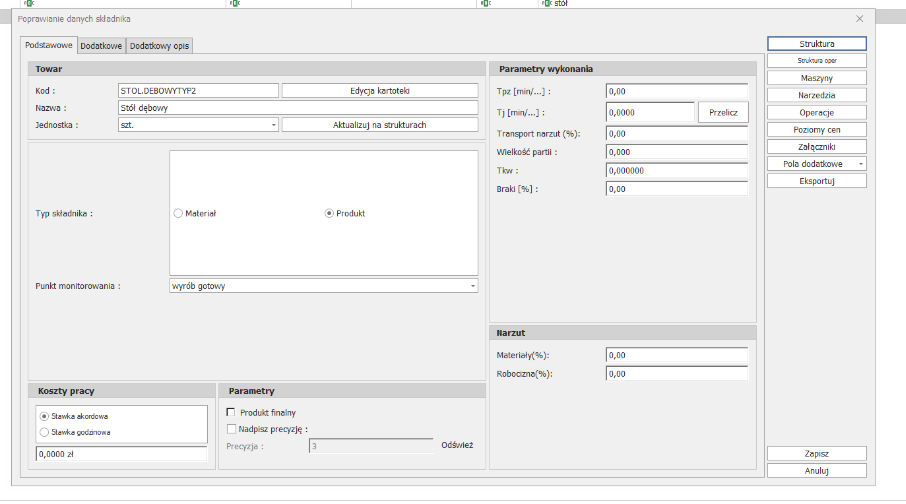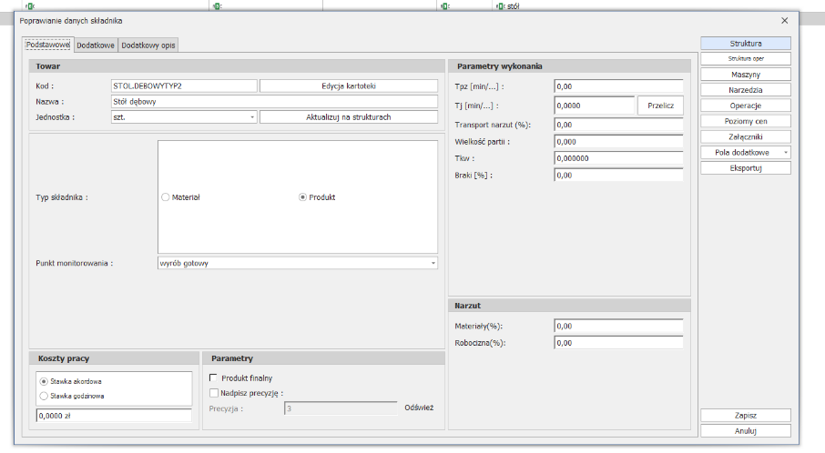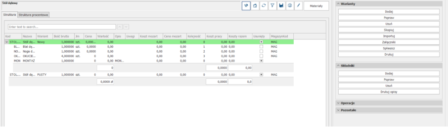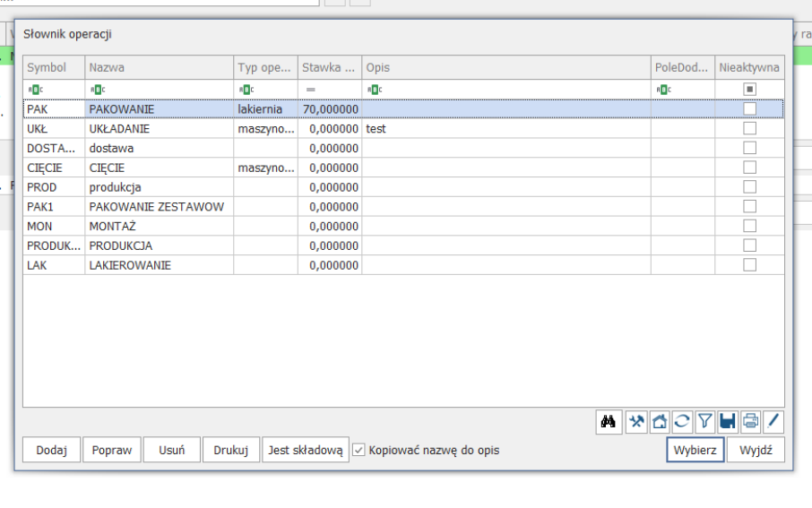 Podobnie sytuacja wygląda dla OPERACJI. Wybieramy wariant produktu i dodajemy/usuwamy/poprawimy istniejące: