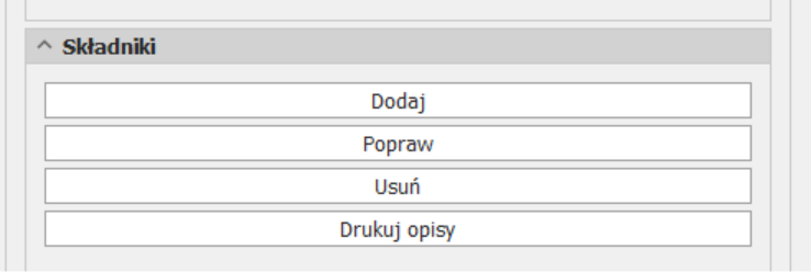 Korzystając z panelu po prawej stronie ekranu, sekcja SKŁADNIKI, można usunąć wybrane lub dodać inne, czy poprawić ilości dla istniejących: