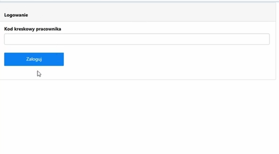 Na początku logujemy się do panelu, za pomocą kodu kreskowego pracownika. Kod pracownika określany jest w słownikach Mozarta. Możemy wpisać go ręcznie lub zeskanować za pomocą skanera do kodów kreskowych.