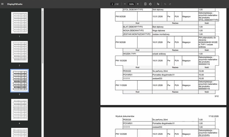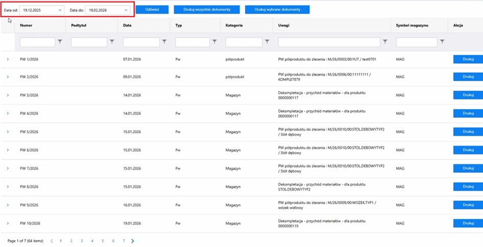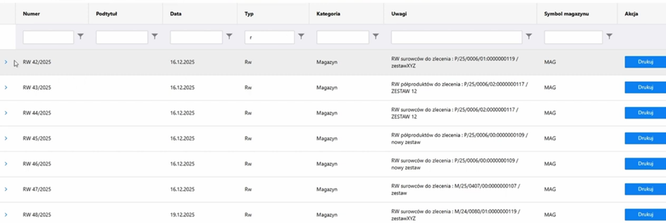 Możemy podejrzeć dokumenty typu; PW, RW, WZ i PZ. Jeżeli użytkownik potrzebuje innych dokumentów, można dopasować ekran do potrzeb pracowników.