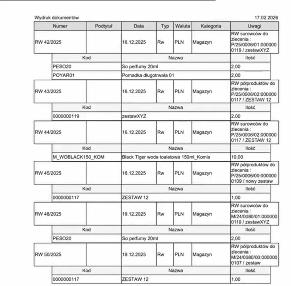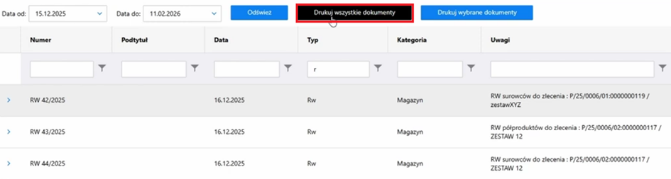 Na tym ekranie możemy zbiorczo wylistować wszystkie dokumenty magazynowe. Możemy podejrzeć składniki jakie występują na tych dokumentach oraz drukować wskazane dokumenty.