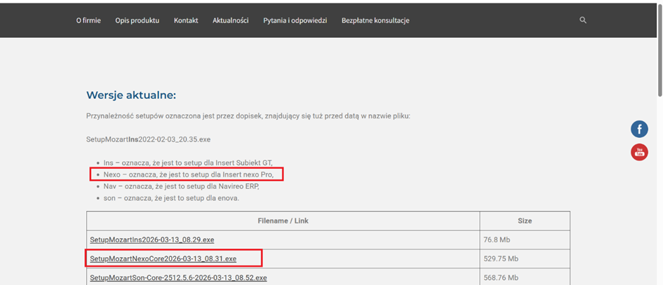 Ze strony https://produkcjaprogramy.pl/pliki-do-pobrania/ pobieramy odpowiednią wersję systemu Mozart Produkcja dla Subiekta nexo PRO. Wszystkie setupy dla tego systemu magazynowego są określane skrótem „NEXO”.