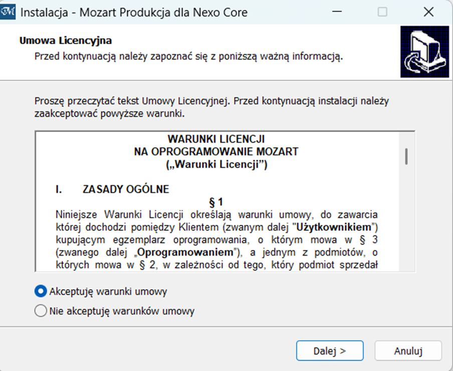 Otwieramy pobrany plik. W pierwszym oknie musimy zaakceptować warunki umowy.