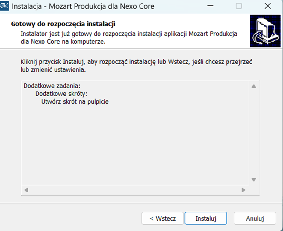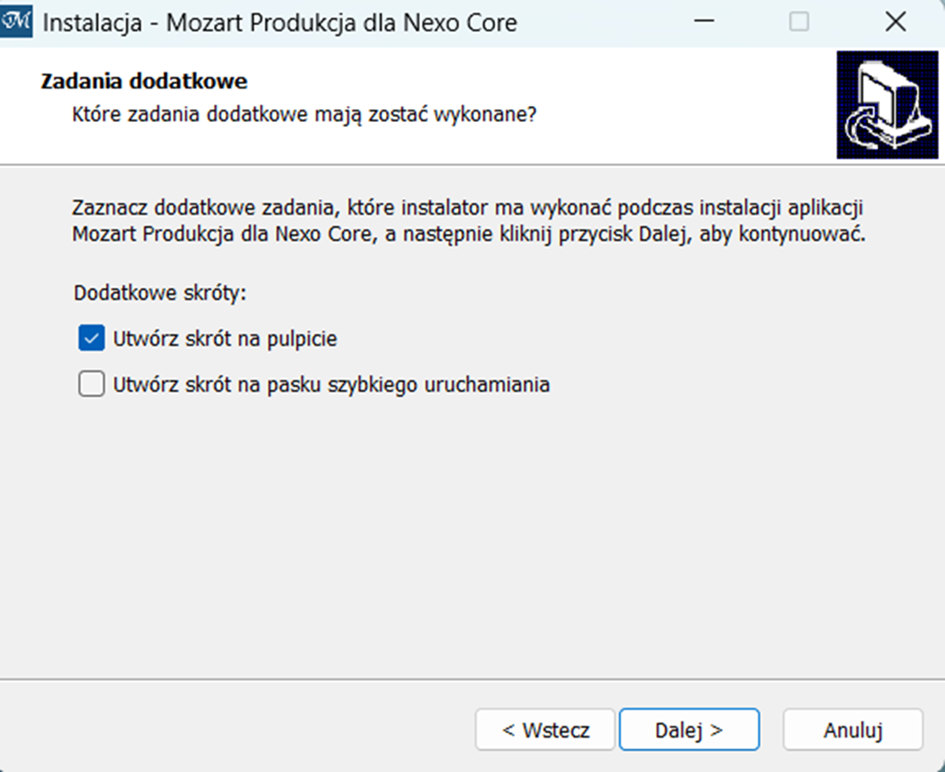 Następnie zaznaczamy czy chcemy utworzyć skrót Mozarta na pulpicie danego urządzenia.