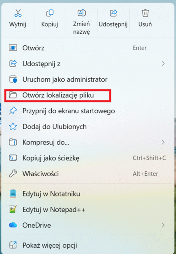Naciskając prawym przyciskiem myszy na ikonę Mozarta Nexo Core wybieramy z menu podręcznego pozycję Otwórz lokalizację pliku.