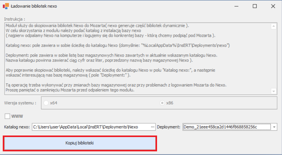 Po zainstalowaniu Mozarta, przechodzimy do konfiguracji Mozarta Nexo Core. Należy wykonać „Ładowanie bibliotek”.
