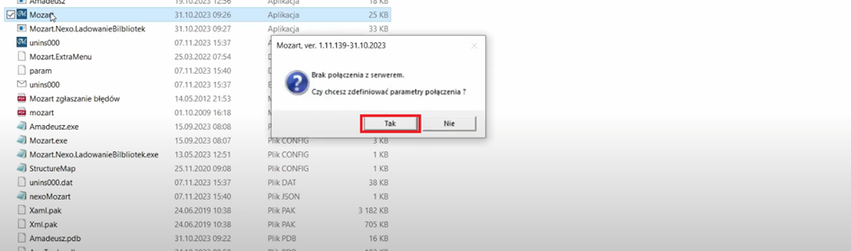 W kolejnym kroku wchodzimy w aplikację Mozarta Nexo Pro. Pojawi się komunikat o braku połączeniu z serwerem, czy chcemy zdefiniować parametry? Zaznaczamy TAK.