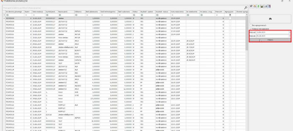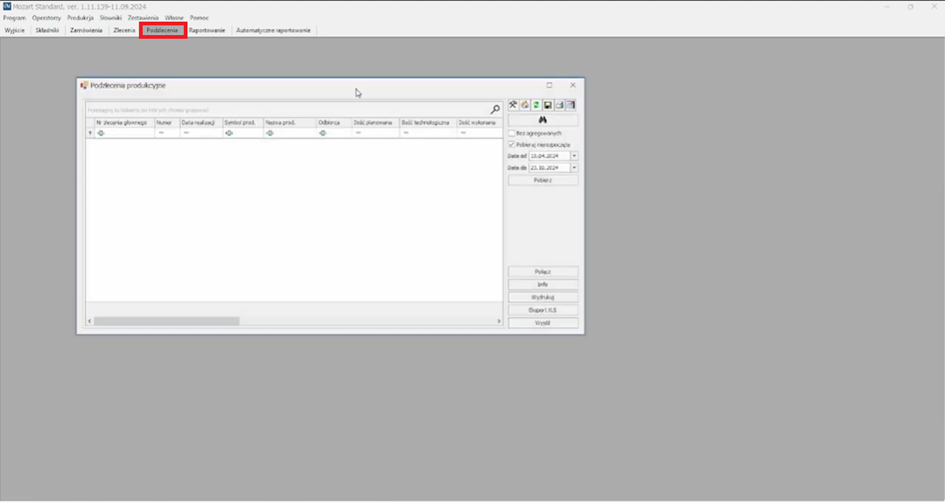 W otwartym oknie podzleceń wskazujemy zakres dat z jakich chcemy pobrać podzlecenia, wygenerowanych w ramach zleceń produkcyjnych.