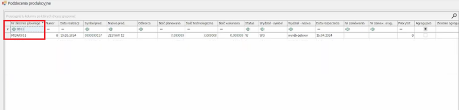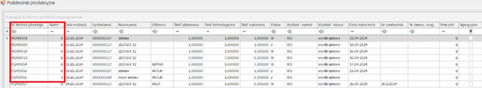 Kolumna „Nr zlecenia głównego” odnosi się do typu zlecenia, roku oraz numeru porządkowego. Natomiast kolumna o nazwie „Numer” oznacza numer samego zlecenia. Liczba wskazuje czy jest to zlecenie główne (0), czy zlecenie dotyczące weryfikacji samego podzlecenia (każda kolejna cyfra).