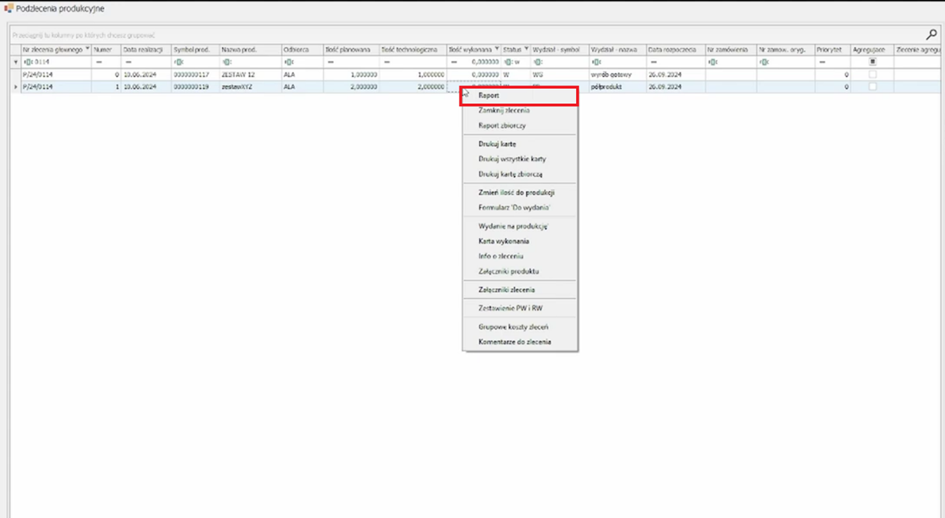 By wykonać raport z poziomu podzleceń należy na wybranej pozycji nacisnąć prawy przyciski myszy i z menu podręcznego wybrać opcję Raport.