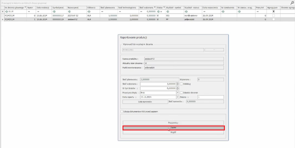 Otwiera się okno do raportowania, takie samo jak w przypadku raportowania z poziomu Ekranu Zleceń. Wskazujemy ilość jaką chcemy zaraportować i zapisujemy raport.