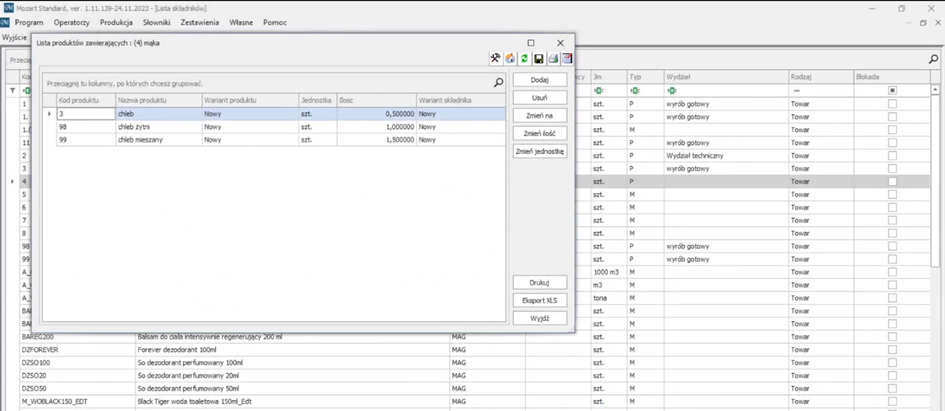 Dzięki tej funkcji wyświetlimy listę produktów, w których znajduje się wskazany składnik. Możemy też modyfikować ilości składników w danych produktach lub usuwać pozycje.