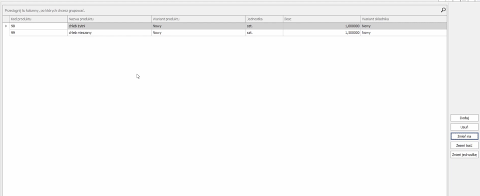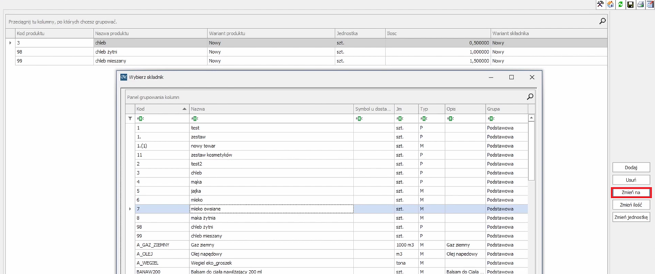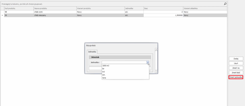 Można również zmienić jednostkę danego składnika, na inną z listy wszystkich jednostek zdefiniowanych w systemie magazynowym.
