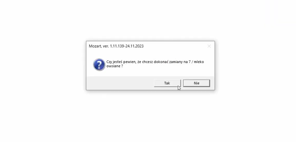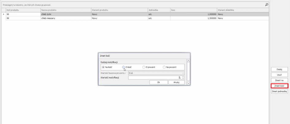 Jeżeli chcemy zmienić ilość danego składnika w wybranym produkcie, wybieramy opcję zmień ilość. Wówczas Mozart wyświetli okno do modyfikacji. Z tego miejsca możemy dowolnie zmienić ilość składnika w pożądany sposób.
