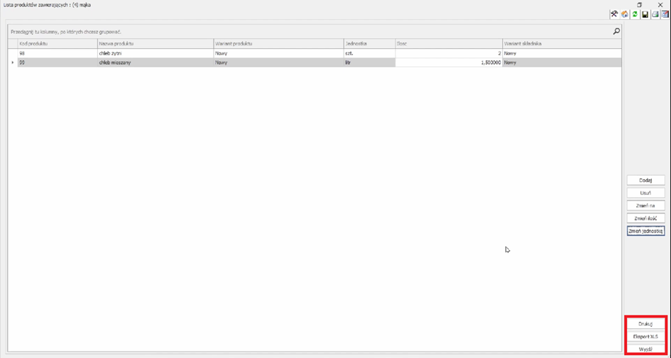 Podobnie jak inne ekrany również ten możemy eksportować do pliku XLS lub wydrukować listę produktów.