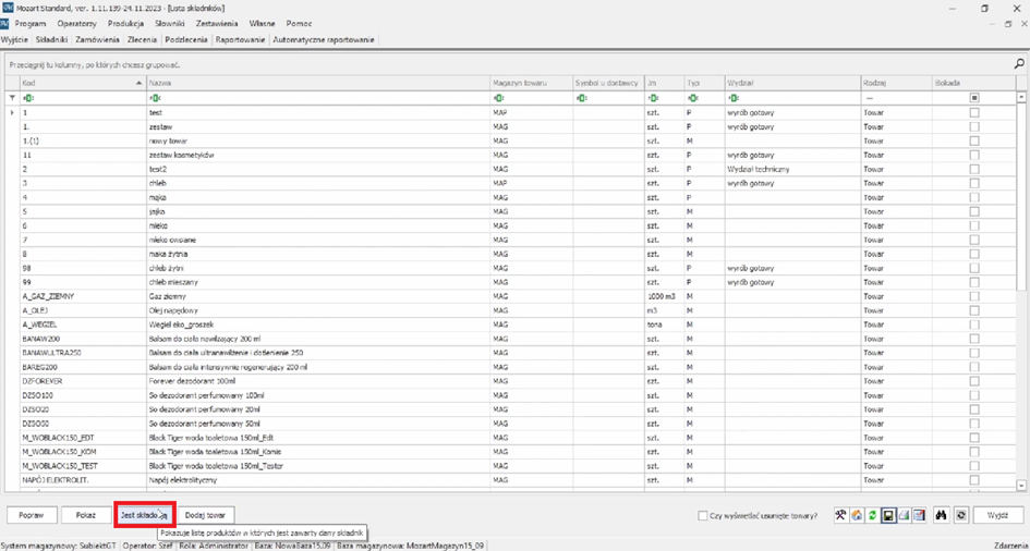 Opcja Jest składową daje możliwość modyfikacji struktur produktów, segregując je po wspólnym składniku.